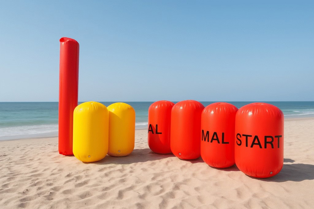 Inflatable buoy made from durable PVC tarpaulin, ideal for branding or marking in water sports and events. Custom shapes and prints available. Great visibility, though prolonged sun exposure may cause color fading.